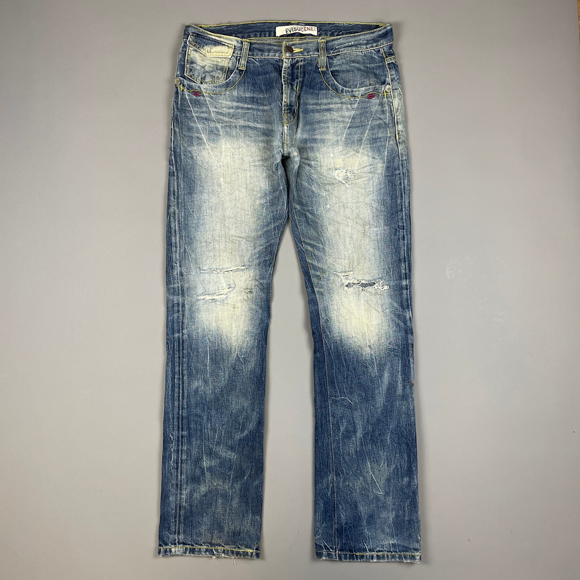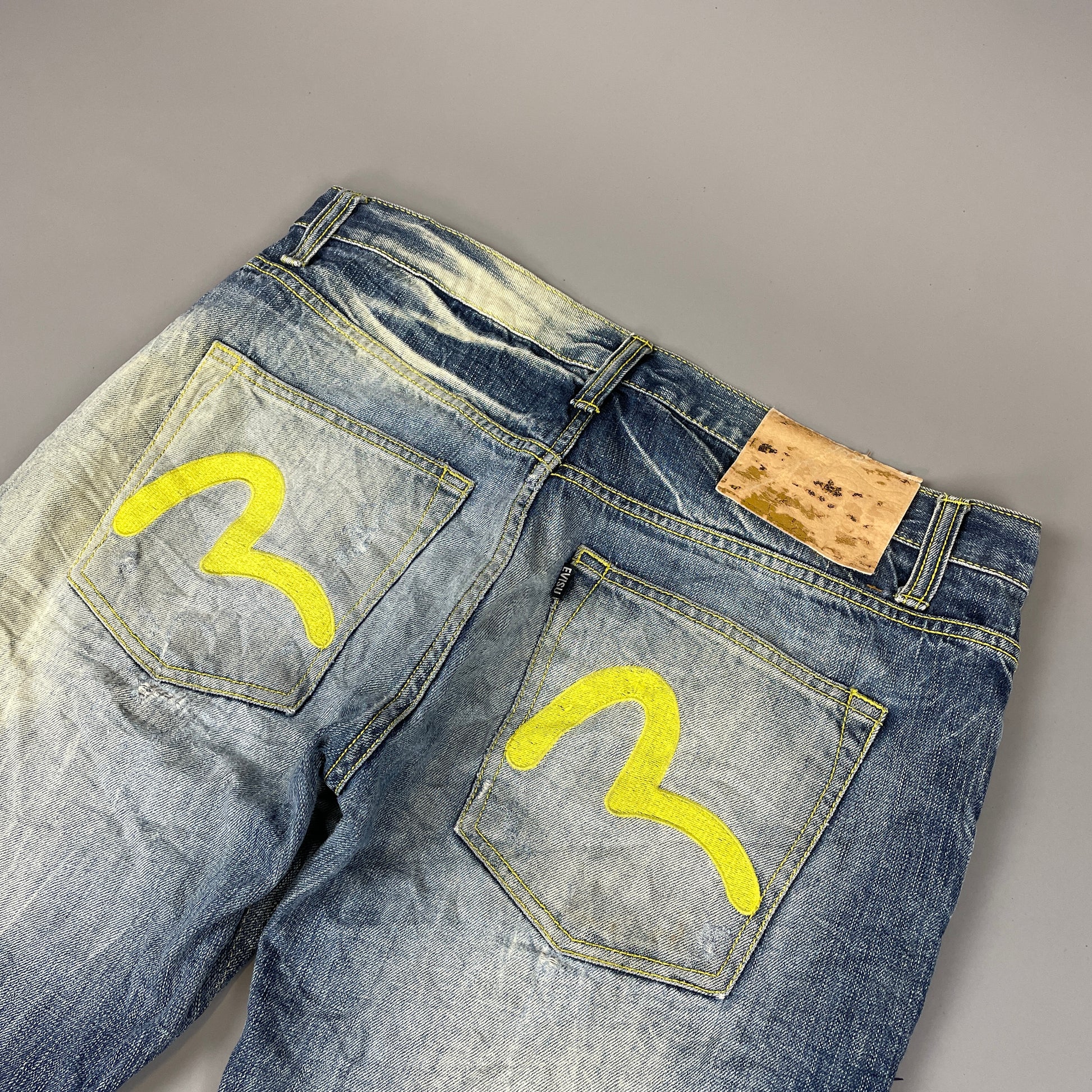• klassische Evisu Logos auf der Rückseite in Gelb gestickt • Evisu Tag auf der Rückseite in weiß • blauer Denimstoff • kleine Rips auf den Knien |